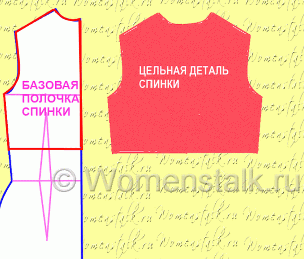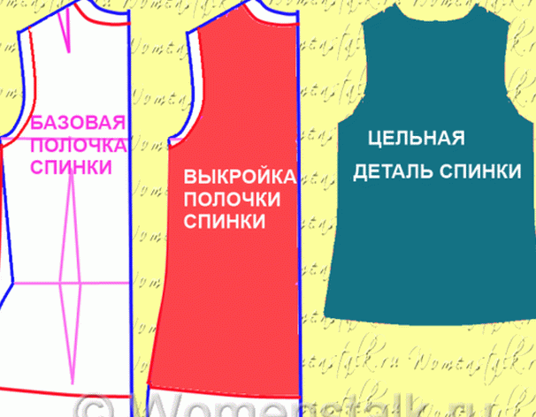 The back pattern is drawn even easier – the arm and shoulder lines and match those that are drawn on the base pattern-base. The neckline is the same depth as on the base pattern. A line the lower edge of the topic from the back (as with the front part) passes to 7-10 cm higher than the waistline.