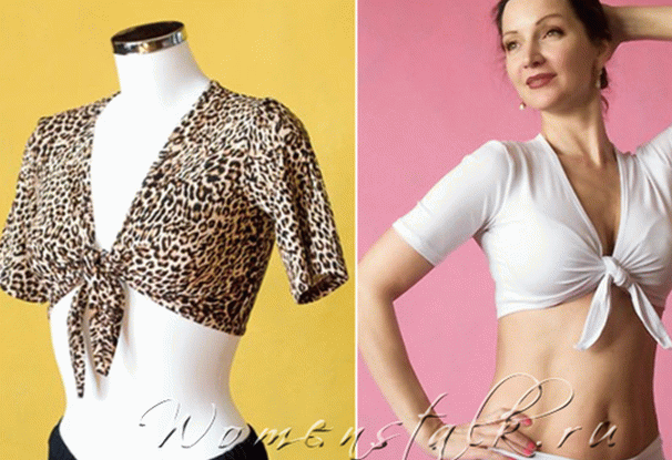 Good afternoon, we continue to model tops – we have already sewn classic top of a direct silhouette, as well as sewn a topic from lace guipure fabric with stretch lining. Today we will continue to sew from the stretch and make simple, but cute topics with ties on the knot. These tops are: p >