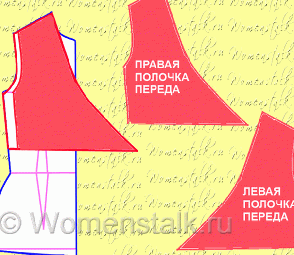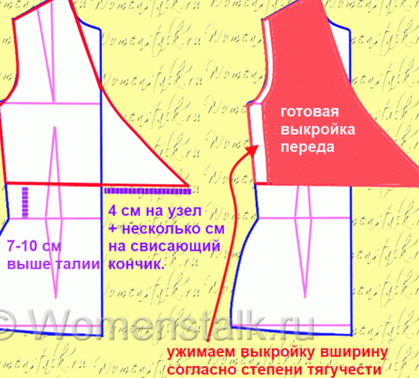 Now smooth out the fit of the side lines (so that the topic does not fit us at the waist, but is slightly free). Even if you look closely at the photo, it becomes clear that the detail of the front end is specially expanded down to when the knot is tied up, it turns out a sort of assembly of folds going with all sides to the site of the node. So on our pattern, we are expanding side lines.